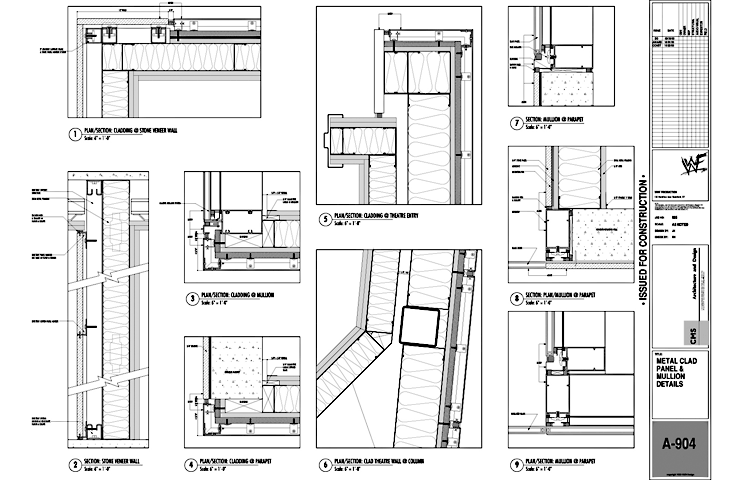 • Exterior Lighting Details: Recessed Ramp Lights • Poured Concrete Staircase w/recessed Lighting • Metal Wall Panel Cladding Details • Wood Wall Panel Details • Framing & Foundation Section Details • Exterior Fireplace Sections & Details • Complex Metal Storefront Section Details